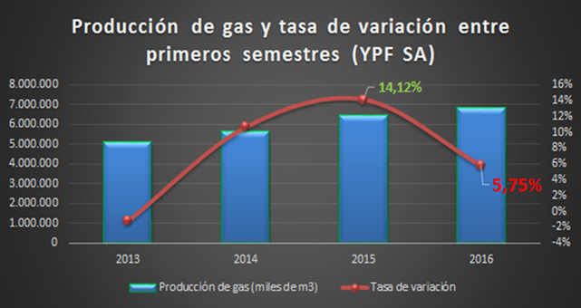 La producción de gas de YPF SA se recuperó a partir de su renacionalización en 2012. En el período 2012-2013 presenta una leve caída de -1,26%, mientras que en los períodos 2013-2014, 2014-2015 y 2015-2016 crece la producción interanualmente en 10,63%, 14,12% y 5,75% respectivamente. Si comparamos la situación de 2016 respecto a 2012 la producción de gas se incrementó en un 32%. Ahora bien, sumando a los números de YPF SA la producción de YSUR -compañía subsidiaria de YPF SA desde 2014- el crecimiento de la producción gasífera alcanza un notable 44% (primer semestre del año 2016 respecto a 2012). Este incremento en la producción se tradujo en una mayor participación de YPF en el mercado nacional gasífero, pasando de un 23,25% en 2012 a un 33,29% en 2016.