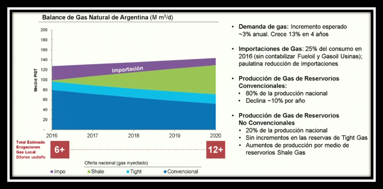 Resulta interesante advertir la tendencia reflejada en el gráfico y que se explica a partir del éxito de los últimos años en materia de políticas gasíferas: la demanda de gas se espera crezca un 3% anual; las importaciones en franca declinación («paulatina reducción de las importaciones») y un notable incremento de la explotación del shale gas.