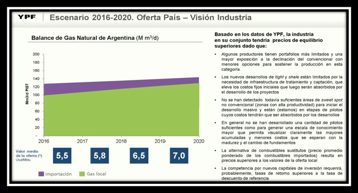 De la diapositiva suministrada por el representante de YPF se observa algo muy importante, estratégico como se verá al final: la desaceleración de la producción de gas entre 2015 y 2016.