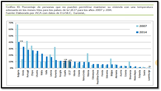Fuente: Asociación de Ciencias Ambientales (ACA). Por una parte, cabe resaltar el significativo incremento de más de tres puntos porcentuales registrado entre 2013 y 2014 donde la pobreza energética en España pasó de 8 a 11,1% en apenas un año. Pero por otro lado, del análisis se desprende que el flagelo de la pobreza energética no es propio de España sino también del sur y del este de la UE.