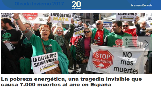 Diario 20 Minutos (18/11/2016) La pobreza energética, una tragedia invisible que causa 7.000 muertes al año en España