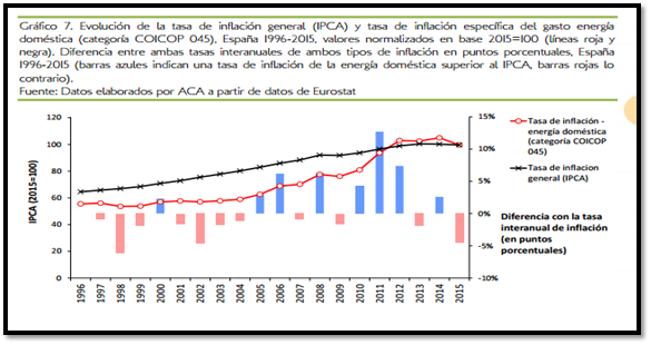 Según ACA, «la tasa de inflación específica de los gastos en energía doméstica superó la tasa de inflación general (Índice de Precios al Consumo Armonizado) en 7 de los 10 años del periodo 2004-2014».
