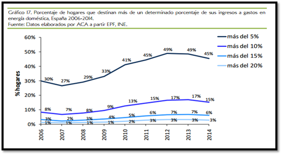 En España, los porcentajes de gastos en energía doméstica fueron creciendo por encima de los porcentajes de ingreso. Es decir, entre 2006 y 2014, los españoles tuvieron que gastar, proporcionalmente, más dinero en energía que lo que recibían por salario. Para 2014, un 45% de los hogares (equivalente a 20,7 millones de personas) gastaba más del 5% de sus ingresos en energía; un 15% de los hogares (equivalente a 6,6 millones de personas) gastaba más del 10% de sus ingresos en energía; un 6% de los hogares (equivalente a 2,6 millones de personas) gastaba más del 15% de sus ingresos en energía; y un 3% de los hogares (equivalente a 1,2 millones de personas) gastaba más del 20% de sus ingresos en energía. Según el indicador clásico de medición de la pobreza energética, un hogar es pobre energéticamente si gasta en luz y gas un porcentaje superior o igual al 10% de sus ingresos.