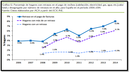 A los 5,1 millones de personas por debajo de la línea de pobreza se le suman unos 4,2 millones de españoles que viven en hogares donde hubo algún retraso en el pago de los servicios básicos durante los últimos 12 meses. La fracción de hogares con dos o más retrasos, que casi se triplicó en el período 2008-2014, pasando de 2,4% a 6,1%. Por su parte, el porcentaje de hogares con un solo retraso se incrementó ligeramente desde el 1,4% hasta el 1,9%. En el informe, ACA señala que desde la crisis de 2008, «el corte por impago aumentó en España y da cuenta de la existencia de un grupo de hogares más vulnerables y cada vez más numeroso incapaz de hacer frente a los recibos de la vivienda, y por tanto, en riesgo de desconexión de suministros básicos».