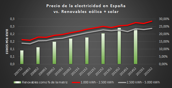 A lo anterior, debe agregarse la incorporación masiva de renovables intermitentes a la matriz española. Como se aprecia de la imagen que sigue, las eólica y solar (PV y Térmica) pasaron de 9% en 2007 a 17,8% (casi el doble) en 2011; para 2013, el incremento superaba las dos veces y media.