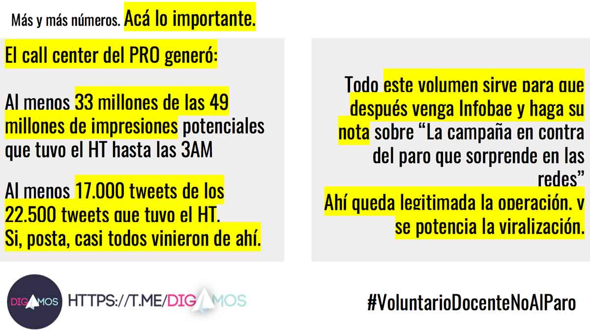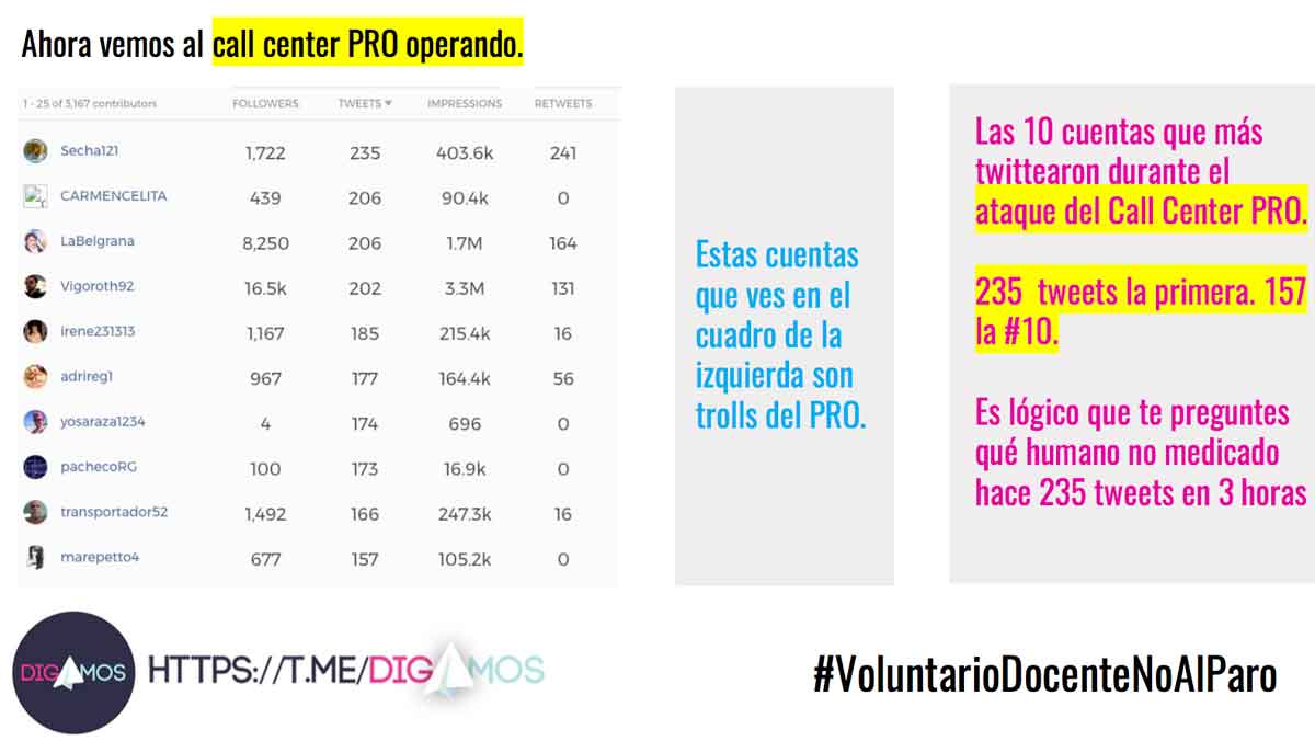 Por citar algunos ejemplos, «la cuenta @Vigoroth92, lanzó 202 tweets para alcanzar una cifra desmesurada de impresiones. No fue la única. De las diez cuentas que más twittearon durante la embestida del ‘call center PRO’, la primera arrojó 235 mensajes –en sólo tres horas- y la décima, 157», aseveran.