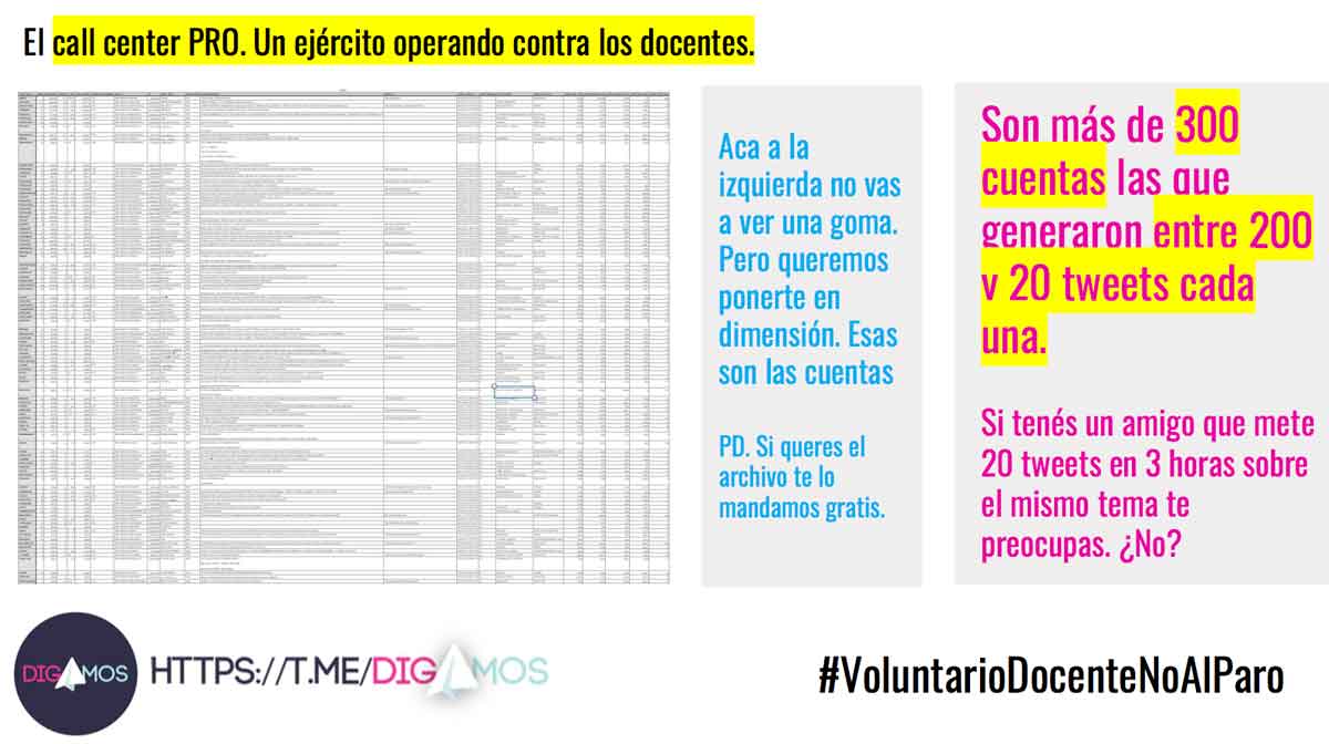 Un informe difundido por la agencia Digamos demostró que «hubo más de tres mil cuentas que generaron entre 200 y 20 tweets cada una con este contenido. Es decir, algunos usuarios –o falsos usuarios, los llamados «trolls»- publicaron 20 posteos seguidos sobre el mismo tema y usando el hashtag en cuestión», informó la agencia Política Argentina este viernes.