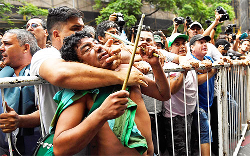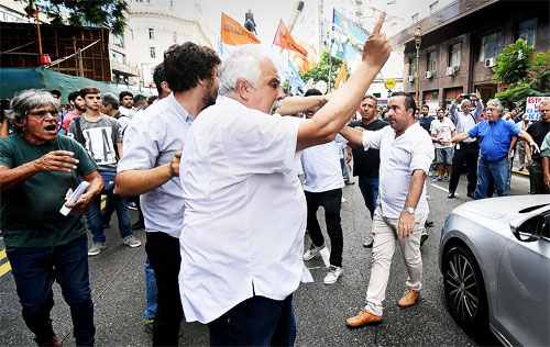 Juan Carlos Schimd, miembro del triunvirato que conduce la CGT, tuvo que retirarse custodiado y Carlos Acuña, también triunviro de la central sindical, sufrió en carne propia botellazos y los reclamos de los manifestantes: «Paro general, paro general».