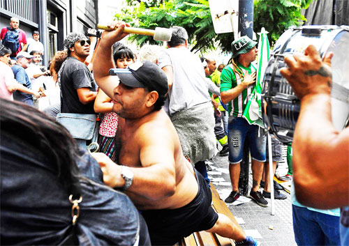 Los disturbios se generaron en la intersección de las calles Diagonal Sur y Moreno, pasadas las 15.40, donde los protagonistas del incidente tiraron el vallado, latas de cerveza, y paraguas con la insignia del gremio de camioneros.