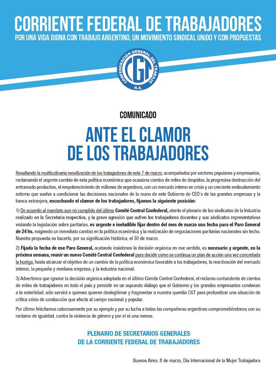 Resaltando la multitudinaria movilización de los trabajadores de este 7 de marzo, acompañados por sectores populares y empresarios, reclamando el urgente cambio de esta política económica que ocasiona cientos de miles de despidos, la progresiva destrucción del entramado productivo, el empobrecimiento de millones de argentinos, con un mercado interno en crisis y un creciente endeudamiento externo que vuelve a condicionar las decisiones nacionales de la mano de este Gobierno de CEO`s de las grandes empresas y la banca extranjera, escuchando el clamor de los trabajadores, fijamos la siguiente posición: