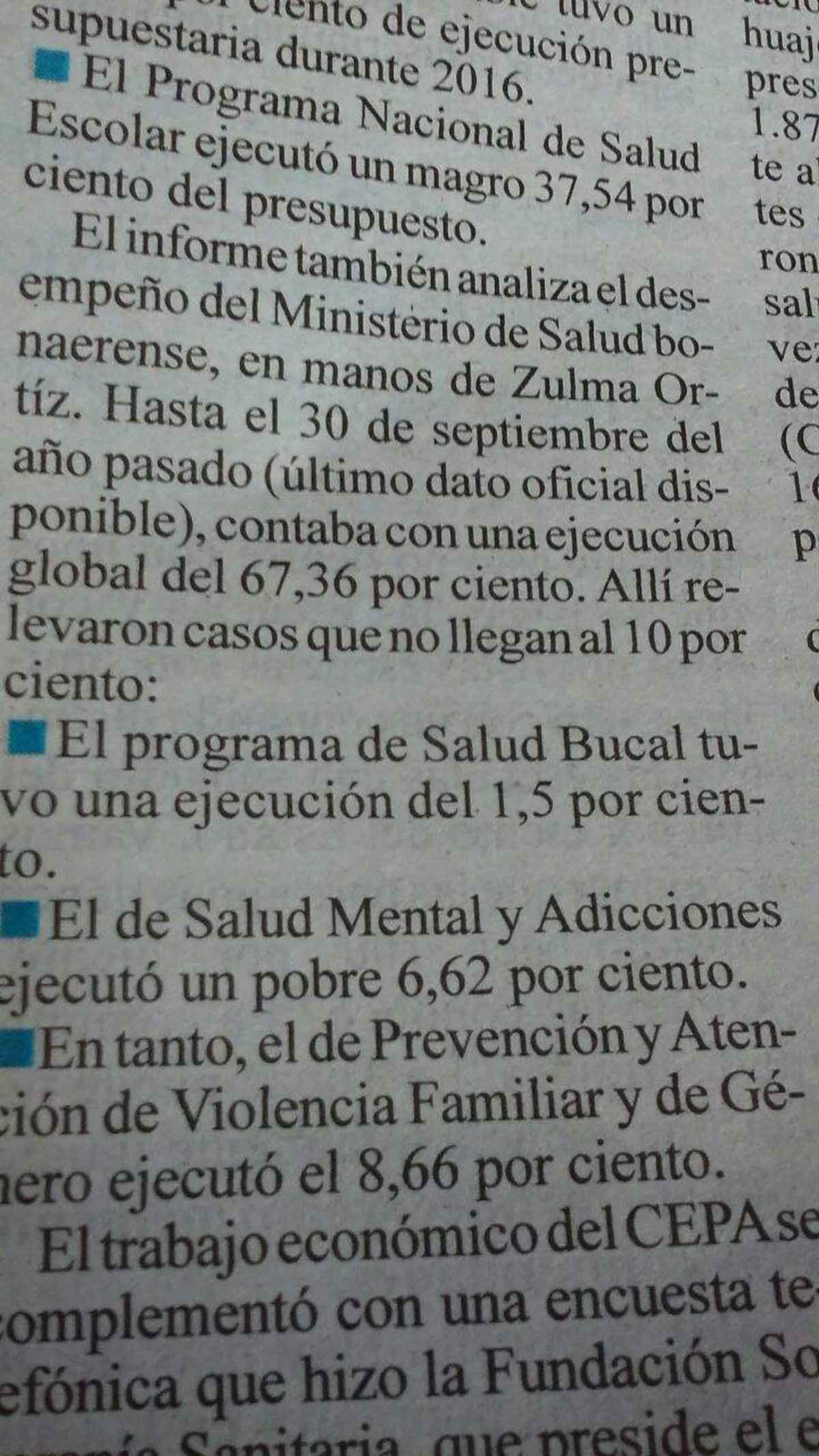 “El aumento total de gastos implica, en realidad, una sensible reducción de fondos de salud en términos relativos, pasando de representar el 2,28 por ciento del total de gastos en 2016 a solo 1,96 por ciento”, indica.
