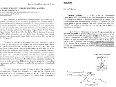 Facsímil de parte de la renuncia que Mariana Stilman presentó en el juicio oral por encubrimiento.