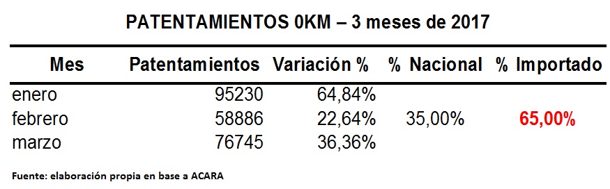 Por cierto, los números de ACARA indicaron que, en marzo, se patentaron 76.745 unidades 0km, lo que significó un crecimiento de 36,4% en las ventas, contra marzo de 2016. El fenómeno ya se había dado en el primer bimestre del año (enero-febrero) cuando se patentaron 154.116 unidades, un 45% más que en el año anterior. Sin embargo, estos datos disfrazan la realidad, menos alentadora, de la industria automotriz argentina, que cristaliza, además, la de toda la industria nacional, abatida por el desplome de la demanda y el tsunami de importaciones.
