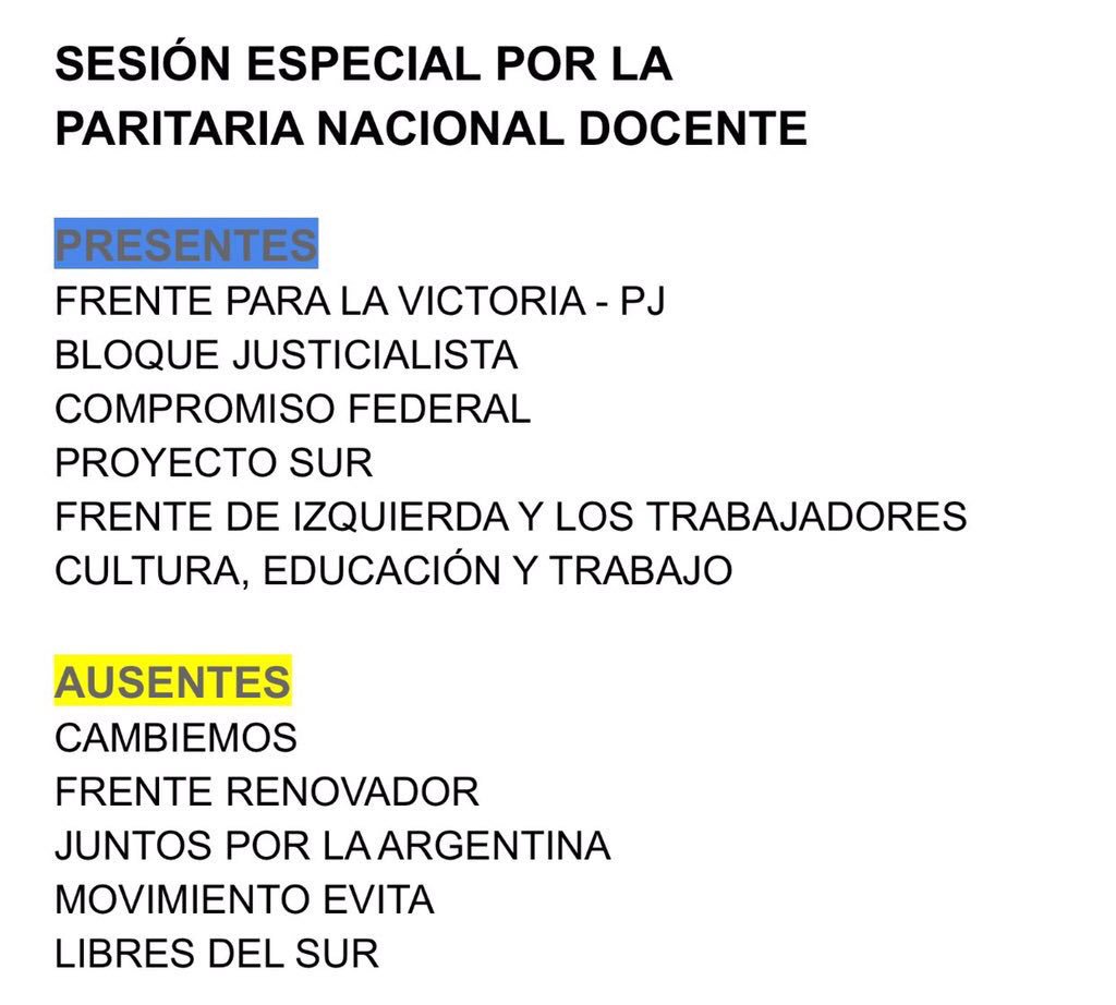 Los bloques de Cambiemos, el Frente Renovador, Libres del Sur, Movimiento Evita y Juntos por Argentina se negaron a debatir y dialogar en la sesión especial. Sin embargo, Héctor Daer, Secretario General de la CGT y Diputado por el Frente Renovador, bajó al recinto y mostró nuevamente su apoyo a la lucha docente.