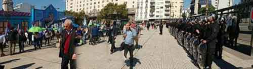 Más de 50 efectivos de la Policía Federal acompañaron a la columna de trabajadores bancarios hasta la Escuela itinerante, instalada frente al Congreso de la Nación.