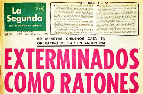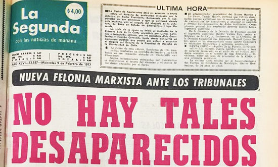 Tristemente célebres son los recordados titulares de La Segunda “Exterminados como ratones” (24/07/1975, vinculado con la “Operación Colombo” de la DINA) y “No hay tales desaparecidos” (09/02/1977).