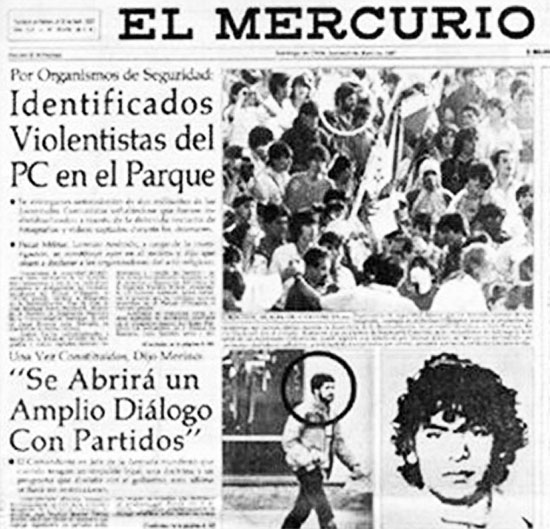 El 9 de abril de 1987 El Mercurio llevó en su portada las fotografías de dos jóvenes, Iván Barra y Jorge Jaña, acusándolos de haber sido parte de los “violentistas” que participaron en los desmanes en el Parque O’Higgins en medio de la visita del papa Juan Pablo II.