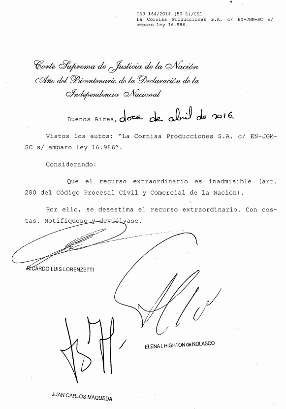El 12 de abril de 2016, la Corte Suprema de Justicia de la Nación, con la firma de Ricardo Lorenzetti, Elena Highton de Nolasco y Juan Carlos Maqueda, falló en la causa promovida por la productora La Cornisa Producciones SA de Majul, ordenando al Estado Nacional que volviera a adjudicarle pauta oficial, interrumpida en el año 2011.