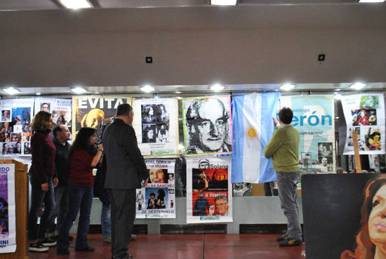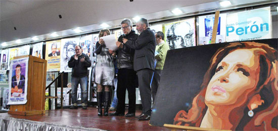 Remata la imagen, por un lado el retrato de Cristina pintado por los Pinguinos que lidera Juan Soriano y por el otro el póster de Saúl Ubaldini el legendario secretario general de la Central de los Trabajadores que presidía el escenario, por celebrarse un nuevo aniversario de la primera huelga que Saúl querido y la CGT le hicieron a la Dictadura del Proceso, pese a las prohibiciones y la represión de la época.