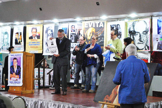 Pueden verse en el escenario Jorge Cravero y Claudio Orellano agradeciendo la entrega de la distincion conferida por La Oesterheld, Edgardo Depetri, aplaudiéndolos, antes de recibir la suya, y varios de los Compañeros de Utopías que hicieron los honores.