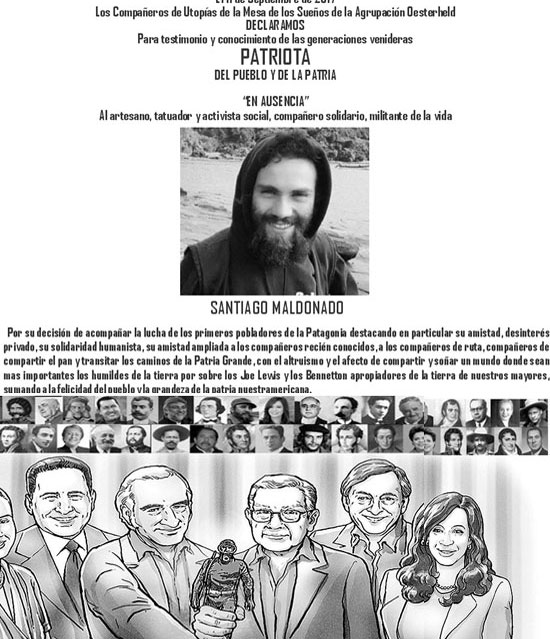 El lunes 11 de septiembre en el salon principal del Bauen Hotel Cooperativa de sus trabajadores, la Agrupación Oesterheld descubrió un poster dedicado al desaparecido tatuador y artesano Santiago Maldonado. También, los Compañeros de Utopías entregaron a los amigos de su familia enviados por su hermano Sergio, la declaración de «Patriota» para Santiago en el marco de una reunión muy emotiva que incluyó a Lidia y Osvaldo Papaleo, Juan Alonso, Julio Ricardo, Claudio Orellano y los diputados Edgardo Depetri, Miguel Funes y Juan Carlos Diaz Roig