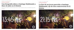 En esta nota, el periódico, además de mostrar una fotografía poco clara la cual apunta que fue sacada a fines de julio en el centro turístico rionegrino, continúa con una serie de testimonios de personas que aseveran haberlo visto allí hasta el 29 de julio “entero”, “impecable” y “perfecto”, casi intentando poner en duda la presencia de Maldonado en la protesta mapuche que derivó en el violento operativo de Gendarmería y su posterior desaparición.