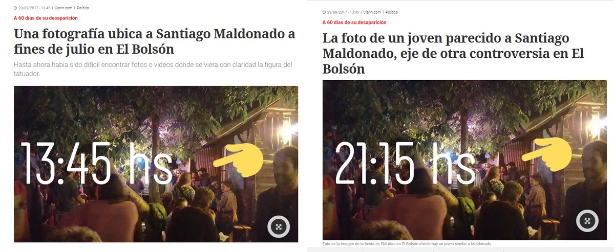 Lo más curioso de esta última operación clarinista es que la fotografía que sindican sería de fines de julio, tiene a gente vistiendo remeras o ropas livianas, con los follajes de los árboles a pleno, siendo que pocos días antes de cuando sindican la fotografía habría sido tomada, según ellos, hubo fuertes temporales y nevadas. Para colmo, en el epígrafe de la fotografía sostienen “Esta es la imagen de la fiesta de FM Alas en El Bolsón donde hay un joven similar a Maldonado”, y esto es cierto, solo que la celebración organizada por esa radio tuvo lugar el 20 de marzo.
