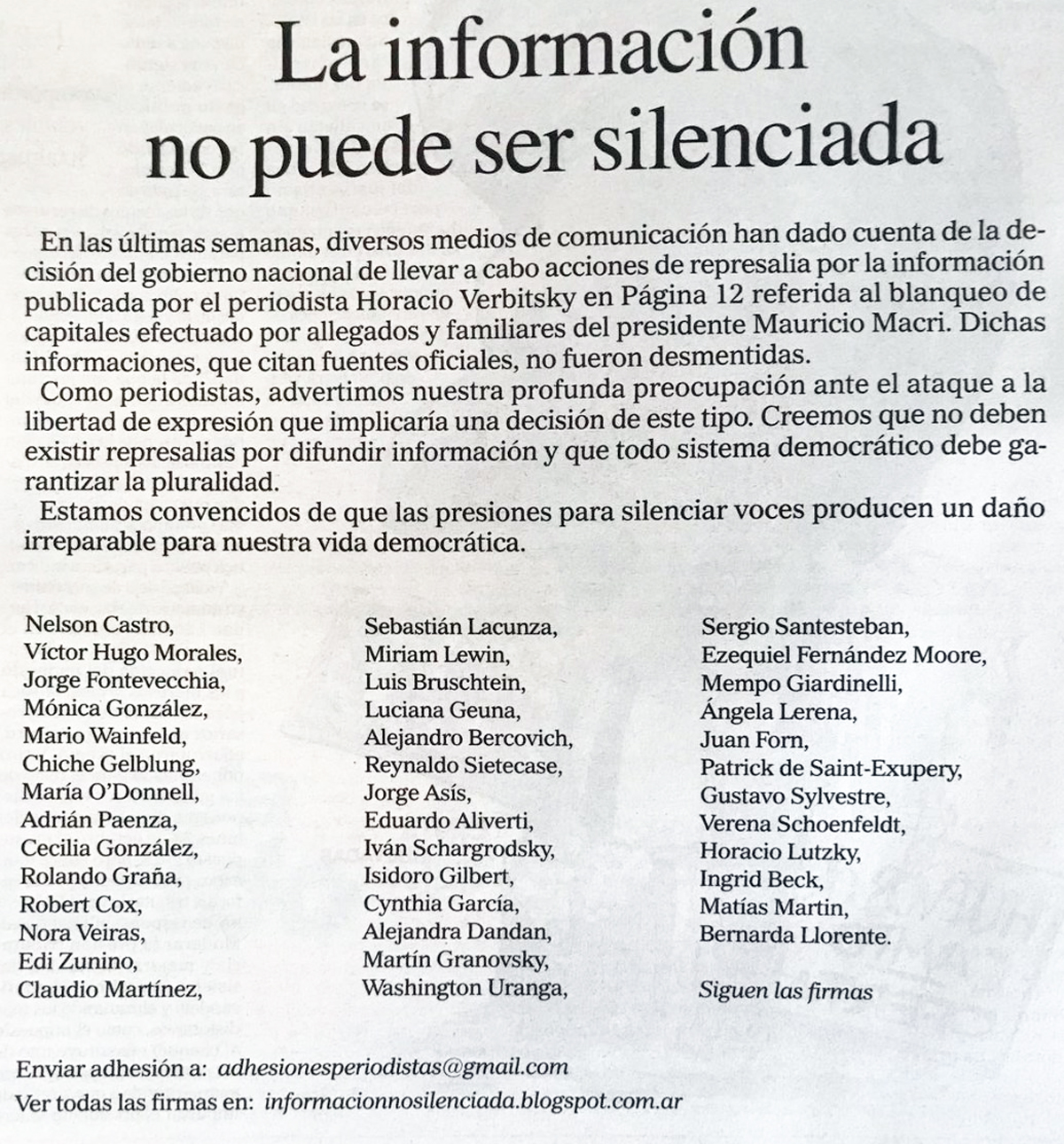Un grupo amplio de periodistas firmó una solicitada donde cuestiona al Gobierno de Mauricio Macri por presionar para que no se difunda una investigación de Horacio Verbitsky, publicada en Página 12, que da cuenta de la inclusión en el blanqueo de capitales de familiares y allegados al presidente Mauricio Macri y de otros funcionarios de primer nivel del Ejecutivo. El caso de Macri es el más relevante: su hermano Gianfranco blanqueó 32 millones de dólares (más de 600 millones de pesos) gracias a los cambios que el presidente hizo al reglamentar la ley aprobada por el Congreso Nacional. La investigación puso además el foco sobre las dudas existentes en torno a la fortuna presidencial: ¿Una parte de su patrimonio no está declarado?