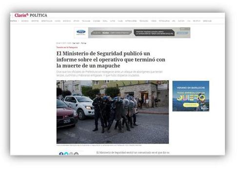 El domingo 26, pasadas las 18 hs., fuentes de máximo nivel del ministerio del Seguridad de la Nación soplaron al oído de los editores de turno del diario Clarín que “los mapuche comenzaron a atacar a los dos integrantes del grupo Albatros ´con piedras, boleadoras y lanzas´”.
