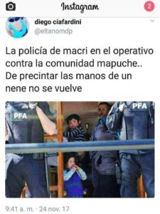 Ya se afirmó en la “Crónica de hectáreas manchadas de sangre”, escrita “en homenaje” a Santiago Maldonado y, lamentablemente, publicada “en memoria” del joven muerto bajo presión de un operativo ilegal de la Gendarmería Nacional, otro dispositivo represivo manejado por Bullrich. Las autoridades nacionales pretenden instalar a la pequeña población originaria mapuche como un “peligro”, a partir de falsedades contra un grupo que constituye el 0,3% de los habitantes del país, con solo el 0,09% radicados en Río Negro y apenas el 0,0033 viviendo en comunidad.