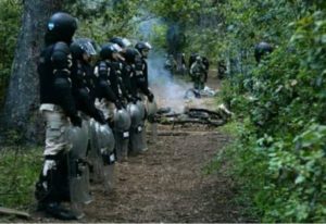 Dos Albatros bajaron 150 metros y otros dos “quedaron escondidos”, hasta que… “escucharon gritos que aparentaban ser gritos de guerra (sic) y observaron el desplazamiento de un grupo de entre 15 y 20 personas encapuchadas, con máscaras antigases de tipo militar y banderas con lanzas que en sus puntas tenían atados cuchillos”, además de “armas blancas, por lo que la patrulla de Prefectura esperó escondida entre la vegetación para evitar ser descubiertos”.
