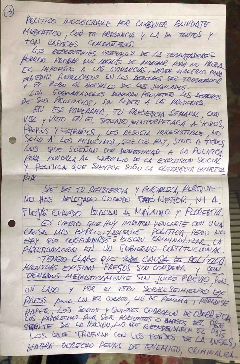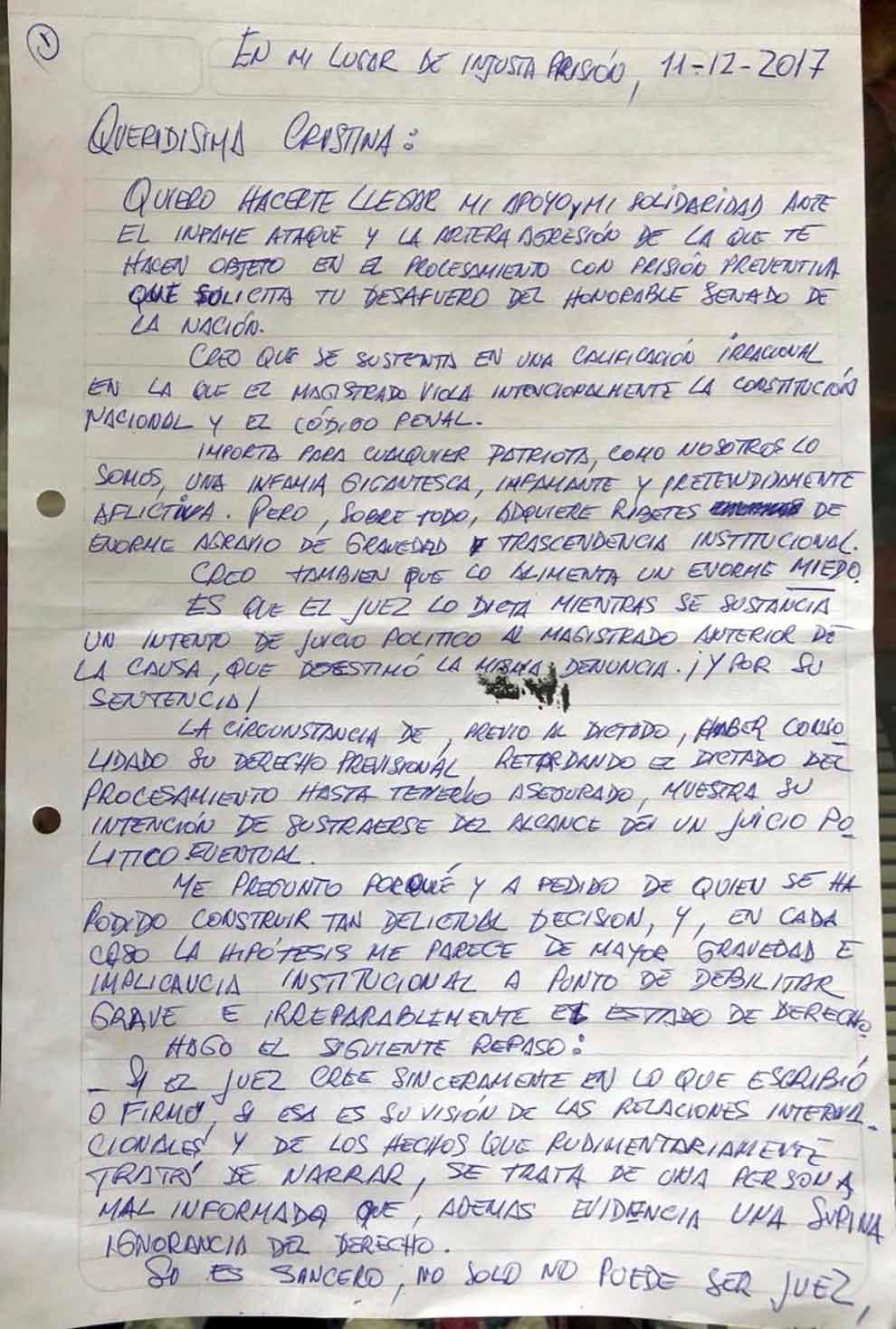 Quiero hacerte llegar mi apoyo y mi solidaridad ante el infame ataque y la artera agresión de la que te hacen objeto en el procesamiento con prisión preventiva que solicita tu desafuero del Honorable Senado de la Nación.