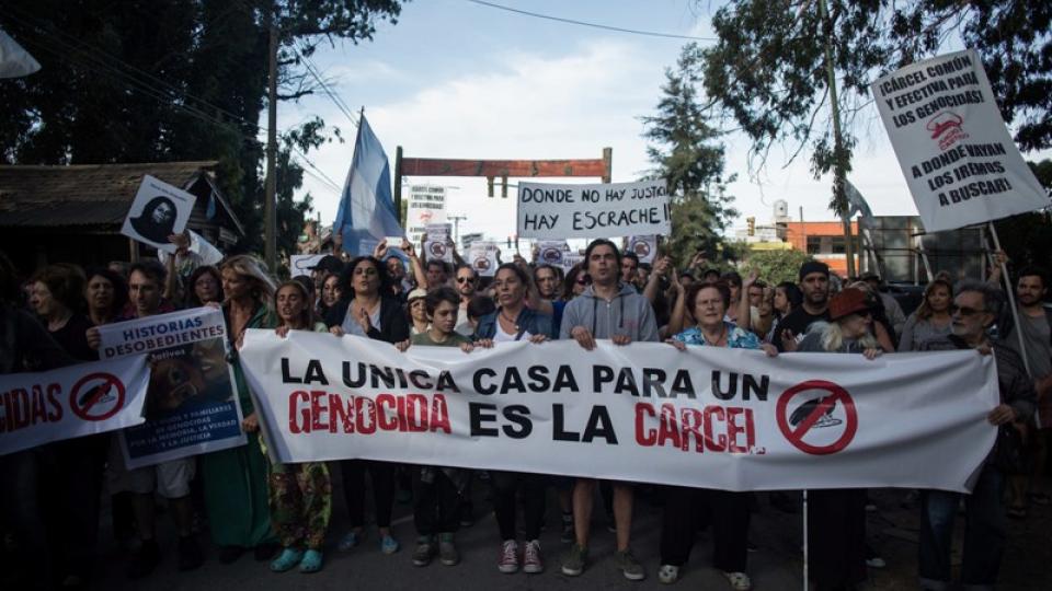 Diversas organizaciones, con eje en los organismos de derechos humanos y la izquierda, recorrieron el barrio cantando «alerta los vecinos, al lado de su casa está viviendo un asesino» mientras se colocaban siluetas que representaban a las víctimas de Etchecolatz. Las fuerzas de seguridad cortaron las calles del centro del barrio e instalaron un vallado para evitar que los manifestantes se acercaran a la casa en donde ahora reside el genocida.