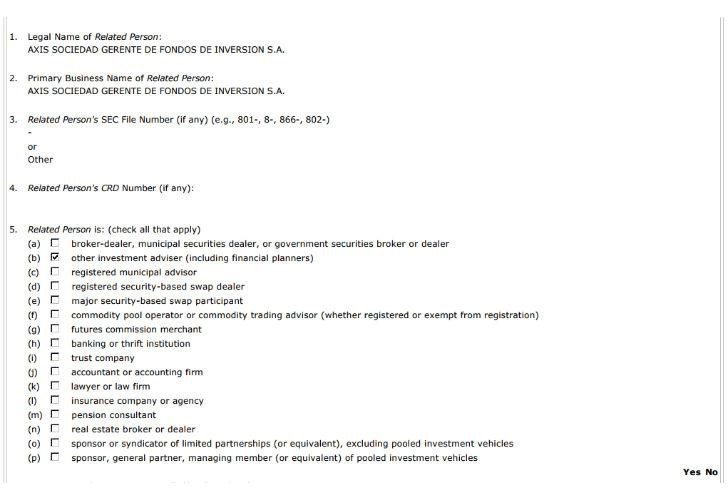 Los documentos ante la SEC comprueban otros vínculos entre Caputo y estos fondos de inversión. Noctua tiene como broker (operador financiero) y afiliada a Axis Sociedad Gerente De Fondos De Inversión SA, la inversora creada por Caputo y otros cuatro socios en la Argentina en 2012, y a la que también renunció el 4 de diciembre del 2015 para asumir como secretario de Finanzas.