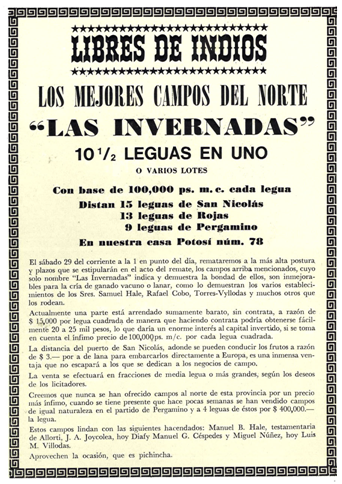 Antigua publicidad de venta de campos en Pvcia. de Buenos Aires, Adolfo Bullrich y Cía.,
