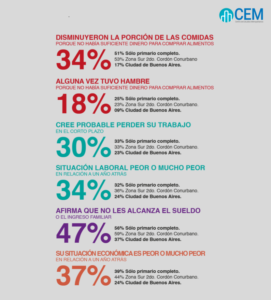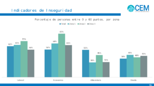 Comparado con el monitor de julio de 2017, el indicador de “Inseguridad Económica”, o sea la percepción de la situación del país y personal, baja de 46 (con un 72% de personas que reportan indicadores de inseguridad económica de 0 a 60) a 40 (con un 80% entre 0 y 60). El indicador “Inseguridad Laboral” baja  de 57 (con un 49% de personas que reportan indicadores de inseguridad económica de 0 a 60) a 50 (con un  60% entre 0 y 60). El indicador de “Inseguridad Alimentaria”, relacionado con las dificultades de acceso a los alimentos, se mantiene estable (sólo baja un punto de 72 a 71). El Indicador de “Inseguridad Sanitaria” también baja, de 58 a 54. En cambio, “Educación” es la única variable donde hay un crecimiento, pasando del 57 al 62.