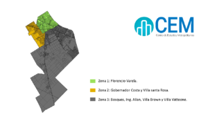 El estudio dividió el distrito en tres áreas. Zona 1: Florencio Varela; zona 2: Gobernador Costa y Villa Santa Rosa y zona 3: Bosques, Ing. Allan, Villa Brown y Villa Vatteone.  El gráfico muestra cómo en la zona 2 se destacan mayores niveles de población vulnerable, alcanzando el 87% en el caso de la dimensión económica.