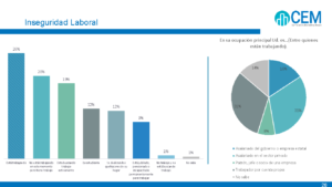 En relación con la dimensión laboral, el 31 % de los encuestados trabaja en algún organismo estatal (31%). Un porcentaje similar manifestó ser cuentapropista. A su vez, el 61% de los trabajadores en relación de dependencia dijo estar registrado.