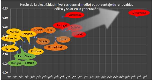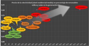 En suma, precios muy bajos de la energía eléctrica (en relación a los germanos y dinamarqueses, los más caros del mundo) se verifican con una diversificación eólica y solar en la generación inferior al 10%. Entre el 10 y el 20% dan un salto importante los precios, sólo compensado si la presencia de combustibles fósiles, nuclear y/o hidráulica son elevadas o muy elevadas. A partir del 22% de renovables intermitentes, los precios vuelven a disparar.