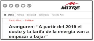 08-03-2018 | El 30 de enero de 2018, Juan José Aranguren fue entrevistado en el programa de radio de Jorge Lanata. Ante la pregunta del economista Martín Tetaz de qué monto de tarifa y con qué aumento respecto de 2018 habremos de pagar en 2019, el CEO-ministro respondió: «Nuestra obligación no es sólo trasladar el costo [a la ciudadanía, producto de la eliminación de los subsidios] sino bajar el costo… Hoy lo que estamos invirtiendo en energías renovables, … y que ya se han comprometido inversiones en 147 proyectos por 6.000 millones de dólares van a permitir tener un costo de generación que es las dos terceras partes del costo que tenemos hoy. O sea, estoy convencido que, a partir de 2019, una vez que se recompone, el costo y la tarifa van a empezar a bajar en la medida también que tengamos una inflación a la baja».