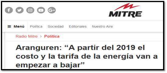 Entrevista de Jorge Lanata a Juan José Aranguren, 30 de enero de 2018. https://radiomitre.cienradios.com/aranguren-a-partir-del-2019-el-costo-y-la-tarifa-de-la-energia-van-a-empezar-a-bajar/