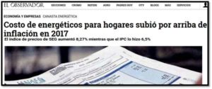 Fuente: Diario El Observador (Uruguay), 10 de enero de 2018. Se lee: «El cambio de la matriz energética uruguaya hacia fuentes renovables -que implican costos menores de producción- no termina de llegar al bolsillo de los hogares uruguayos. De acuerdo el Índice de precios de los energéticos residenciales (IPER) -que divulgó este miércoles la consultora SEG Ingeniería-, la canasta que consume un hogar (incluye energía eléctrica, leña, gas y fueloil) aumentó 8,27% en los 12 meses a diciembre, esto es casi dos puntos porcentuales por encima de la inflación que registró Uruguay en 2017».