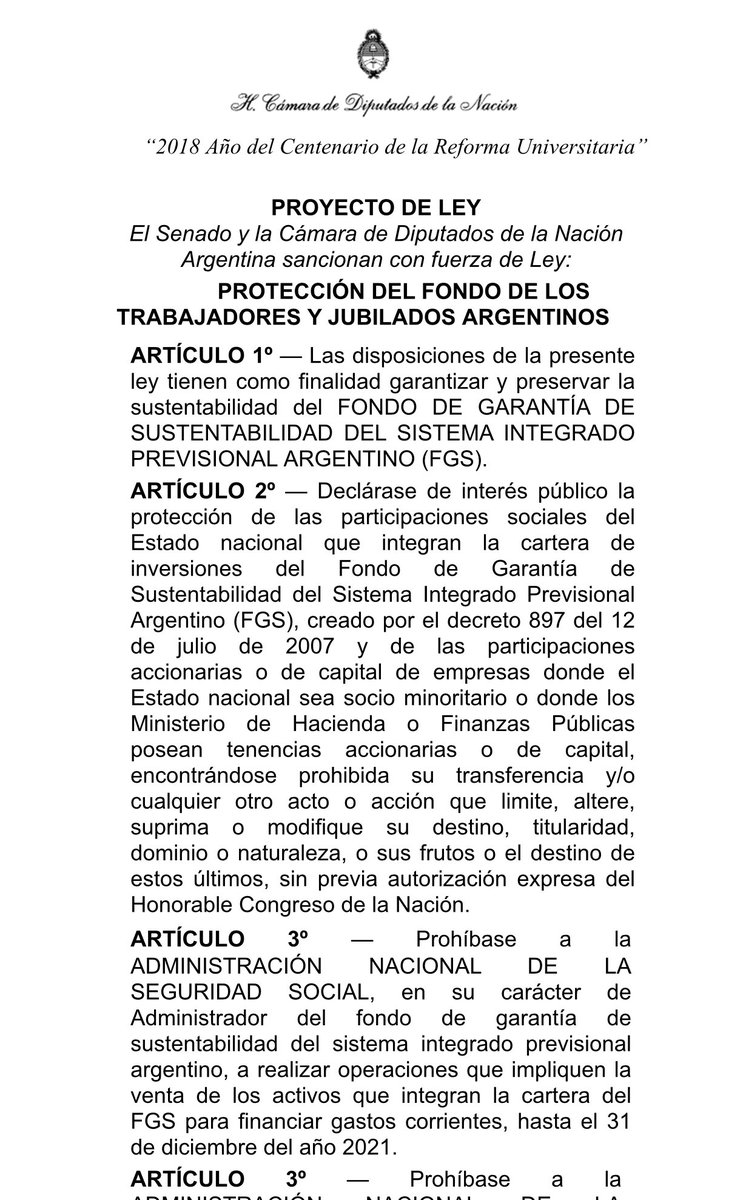 Proyecto de ley que busca proteger el Fondo de Garantía de Sustentabilidad (FGS) de la ANSES, ante los trascendidos de que el Gobierno podría disponer su venta por pedido del FMI.