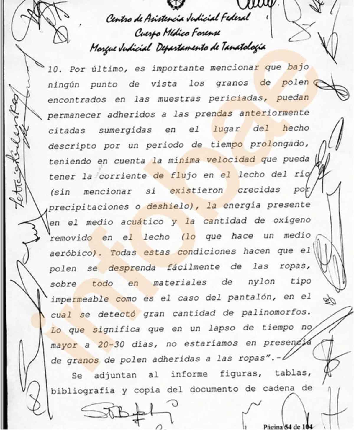 El texto, ubicado en la foja 54, dice que «bajo ningún punto de vista los granos de polen encontrados en las muestras peritadas, puedan permanecer adheridos a las prendasanteriormente citadas, sumergidas en el lugar del hecho descripto por un período de tiempo prolongado».