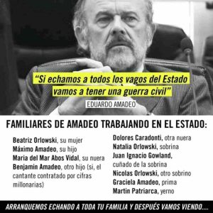 Para Amadeo, lo que ocurrió fue que «el kirchnerismo los multiplicó por tres» usando el dinero «para pagar vagos», y puso como ejemplo a los trabajadores del Astillero Río Santiago y la agencia nacional de noticias Télam, de la que Hernán Lombardi despidió al 40% de la planta de manera ilegal. “Entre tantos horrores que hizo fue pagar vagos con el dinero de todos los argentinos”, y ahora, “si los echamos vamos a tener una guerra civil”, lanzó.