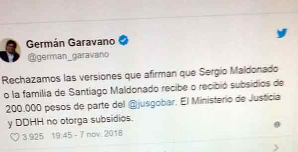 “Rechazamos las versiones que afirman que Sergio Maldonado o la familia de Santiago Maldonado recibe o recibió subsidios de 200.000 pesos de parte del @jusgobar. El Ministerio de Justicia y DDHH no otorga subsidios”, escribió Garavano sin mayores aclaraciones.