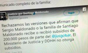 “Aclaramos nuevamente: No recibimos nunca ningún subsidio de este ni de ningún otro Ministerio. Soportamos a diario el hostigamiento, la humillación y la persecución de parte del estado y sobretodo de los medios de comunicación. Esto habla a las claras que los medios de comunicación han sido un brazo para ejercer la violencia contra Santiago, la causa, la familia pero en especial contra Sergio Maldonado”, continúa el escrito.