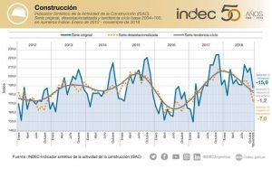 El organismo dio cuenta además que la actividad de la construcción bajó en noviembre 15,9% respecto a igual mes del 2017, o 10,7% si se hace la comparación quitando todos los efectos estacionales, como cantidades de días trabajados.