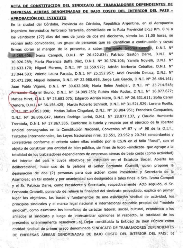 Según publicaron varios medios periodísticos y tal como queda expuesto en el documento que firmó el ministro de Producción y Trabajo, Dante Sica, con aval de su par de Transporte, Guillermo Dietrich, para impulsar el gremio que recogerá a todas las ramas de actividad dentro de una única empresa, el secretario general del sindicato de Flybondi es Matías Miret, el piloto que estuvo dos años preso por volar el avión que transportaba una tonelada de cocaína con destino a Barcelona, tras haber despegado de El Palomar, es decir la famosa aeronave de los hermanos Gustavo y Eduardo Juliá.