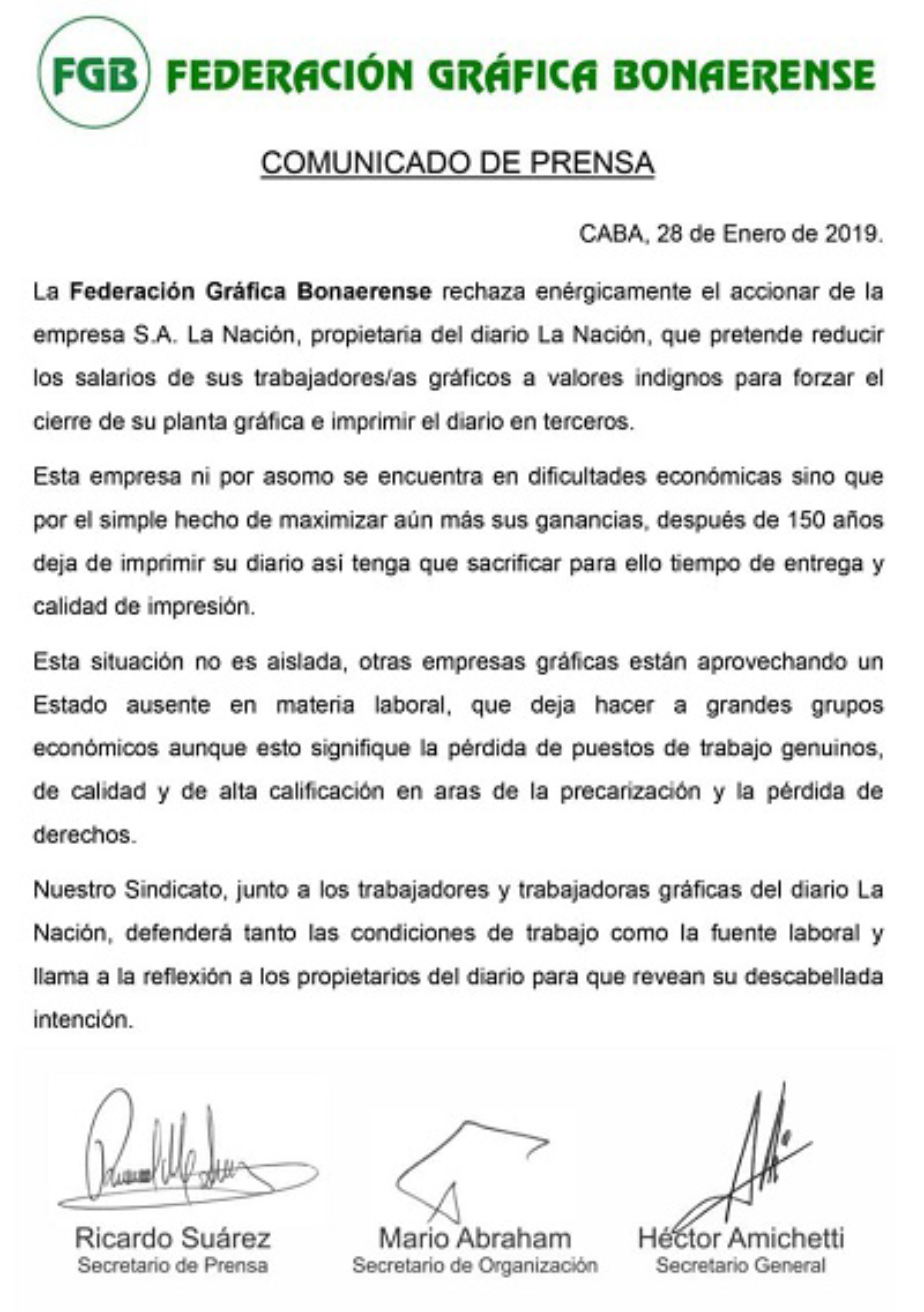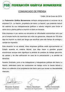 La Federación Gráfica Bonaerense (FGB) expresó en un comunicado que la empresa propietaria del diario La Nación pretendía reducir los salarios de sus trabajadores gráficos “a valores indignos”, con el fin de forzar el cierre de la planta gráfica e imprimir el diario de manera tercerizada.